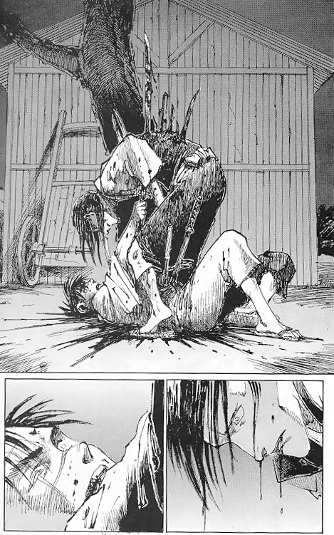 Hage is one of Anotsu's followers. He wields a double-headed spear with remarkable skill. Hage and Manji once fought in Master Sori's yard. Manji was pinned to a tree by Hage's sharp multi-hooked rope. Manji, with his immortality, manages to rip himself off the tree to strike at Hage. But before Manji could lift his sword Hage was slain by Master Sori. |
